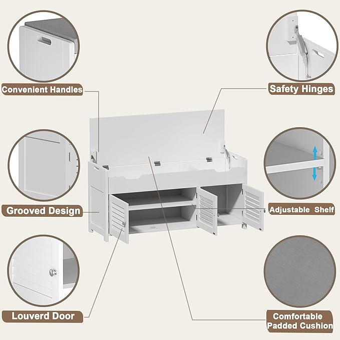 ChooChoo 41.3" Shoe Storage Bench with Lift Top Storage, Entryway Bench with Cushioned Seat, Adjustable Shelf, Shoe Cabinet with Hidden Space, for Entryway, Bedroom, Living Room, White