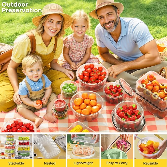 - Durable, Lightweight & Versatile: These reusable plastic food containers are much lighter than glass, making them easy to carry for daily use or outdoor activities. Whether storing leftovers, fruits, vegetables, or dry foods, these containers are the perfect storage solution for home, work, camping, and picnics
