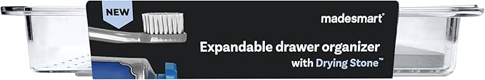 madesmart Expandable Dental Tray Drawer Organizer with Drying Stone, Clear Plastic Drawer Organizer for Toothbrush, Dental Floss, Water Flosser, Mouthwash