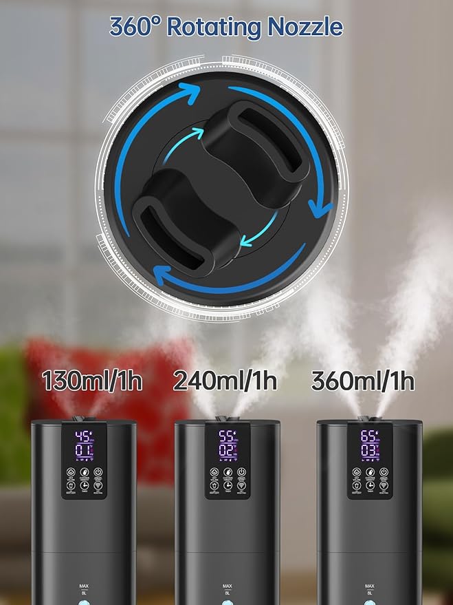 - ใ๐ฃ๐ฟ๐ฒ๐๐ฒ๐ ๐๐๐บ๐ถ๐ฑ๐ถ๐๐ ๐ ๐ผ๐ฑ๐ฒ&๐ฏ ๐ ๐ถ๐๐ ๐๐ฒ๐๐ฒ๐นใAdvanced sensors adjust humidity levels to maintain a consistent and healthy environment. You can customize the humidity level to your liking (up to a maximum of 90% RH), and the humidifier will automatically activate or deactivate to maintain the set humidity, catering to your personalized humidification requirements. The large humidifier has 3 levels of mist volume. The maximum mist volume is suitable for a space of 505 square feet.