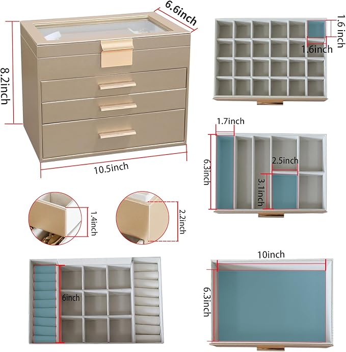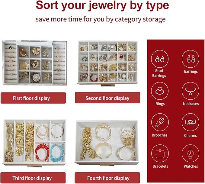 - Space and Time Saving for Makeup Table: With our 6 layer jewelry box, all your jewelry will be in good order and easy to reach. From then on, you have a bright dresser that saves space and makes your room look neater and more elegant. In addition, our jewelry travel boxes are designed to categorize your jewelry at a glance, shortening search time.