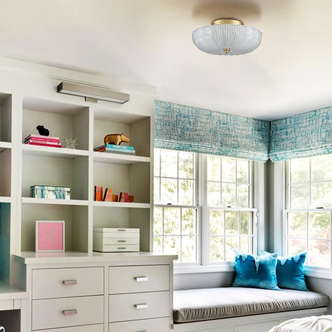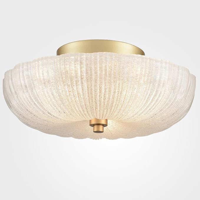 - 🎇Modern Ceiling Lights: Simple round ceiling light fixtures fitting in flower shape, bring a sense of fashion in space and present an elegant and modern style. Made of unique textured fine sand glass,the lampshade is very textured and the reflected light is very warm and beautiful. The metal canopy in brass finish,is durable and sturdy.