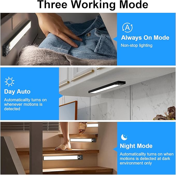 - 【Decently bright, Motion sensor functions perfectly】 The light has three settings, Always On so it stays on until you shut it off, Day Auto the light comes on when during the day time when motion is detected, and Night Auto that comes on only at night when motion is detected,The light shuts off after 30 seconds when there is no motion. This under cabinet light is perfect for under a kitchen cabinet, in a closet, a garage, or pretty much anywhere you need it.