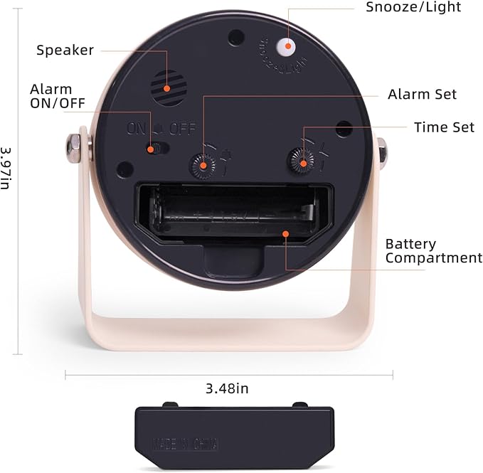 - Compact & Portable - This small, round alarm clock measures just 1.6 x 1.4 x 1.4 inches and weighs a mere 7.8 oz. Perfect for compact spaces like nightstands and desks, and portable enough for travel. Operates on one AA battery (not included).