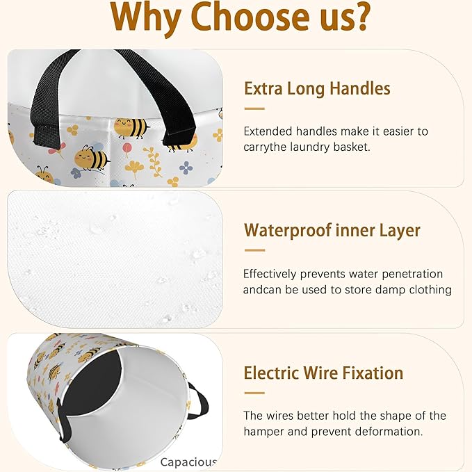 Flying Bees and Flower Laundry Basket,Waterproof Foldable Laundry Hamper,Dirty Clothes Laundry Basket, Linen Bin Storage Organizer for Toy Collection 16" x 20"