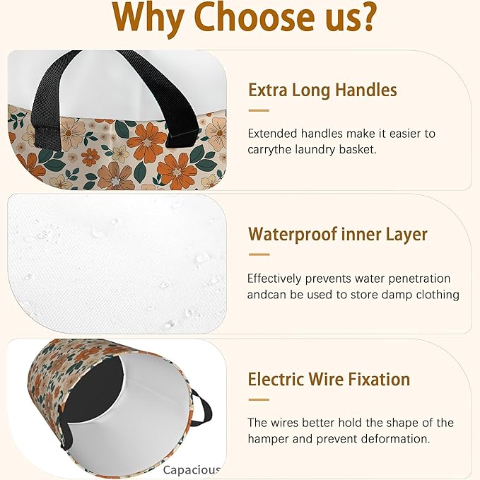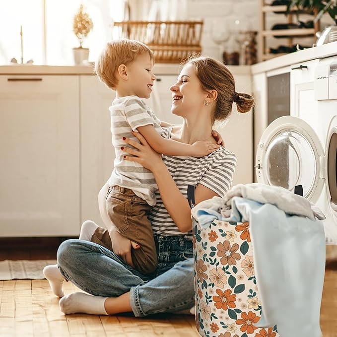 Laundry Hamper,70s Retro Floral Flowers Laundry Basket,Waterproof Foldable Storage Bin for Bedroom,Clothes Organizer Basket,Toys Box 16x20 Inch