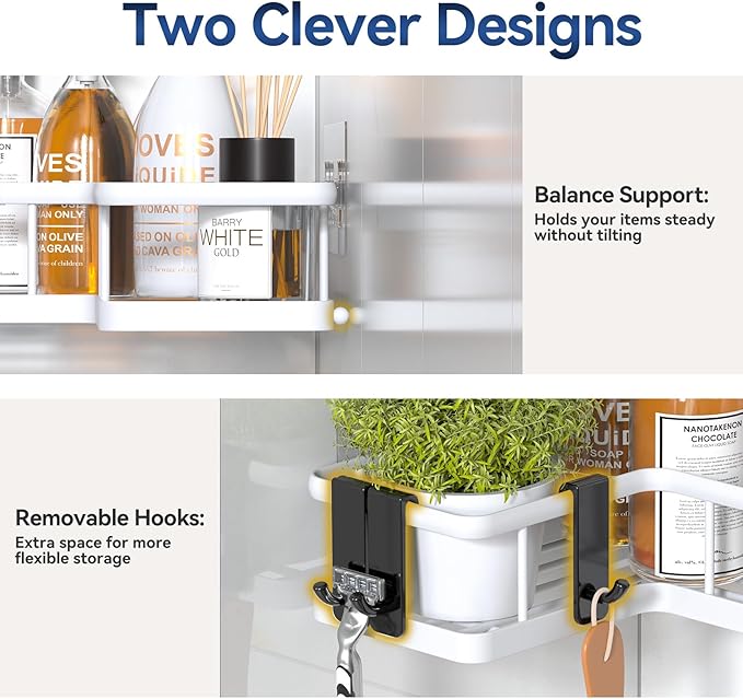 - 5-IN-1 SHOWER ORGANIZER SET:Upgraded L-shaped corner shower shelf maximizes unused 90° wall space with 30% larger capacity than standard models. Holds 19+ full-size shampoo bottles (40lbs) - perfect for bathroom essentials, kitchen spices, or RV storage. The ultimate shower organizer for clutter-free living