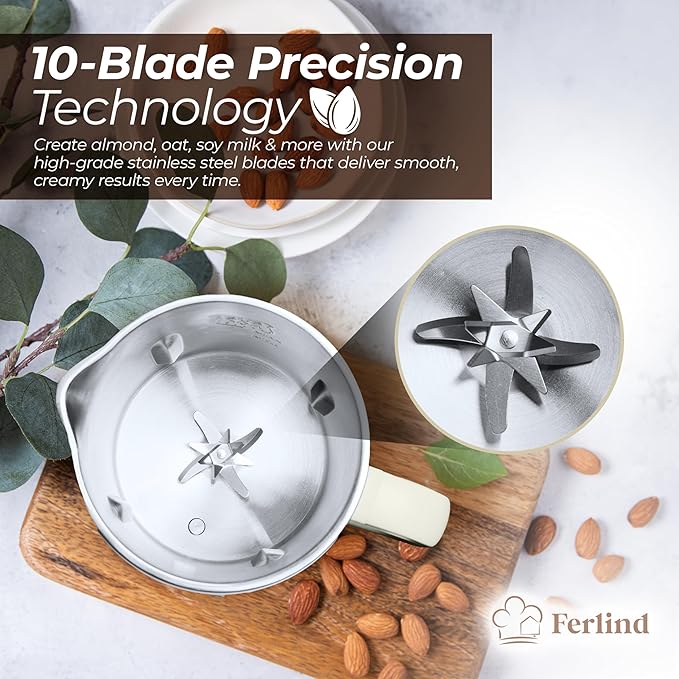 - [Powerful Blending] Equipped with a robust motor and 10 durable stainless steel blades, the Ferlind Nut Milk Maker ensures efficient and thorough blending of nuts, oats, and more. Say goodbye to gritty textures and pulp - each use guarantees smooth and creamy dairy-free milk alternatives. Enjoy perfect consistency and superior taste with every blend.