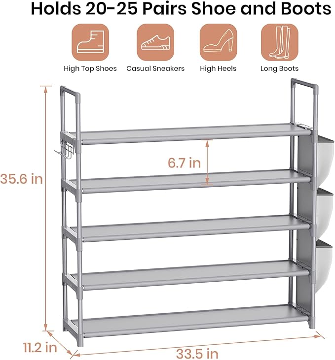 - Large Capacity Shoe Rack: The 5 tier shoe rack measures: 33.5"" wide * 11.2"" deep * 35.6"" tall, the long shoe rack provides large capacity storage space, can hold 20-25 pairs of shoes and boots. The distance between the layers of the shoe rack is 6.7"", which can store sneakers, sandals, slippers, flip-flops, heels, short boots etc. This wide shoe rack provides you with effective help in storing shoes, keeps your shoes neatly arranged, make the room look cleaner.