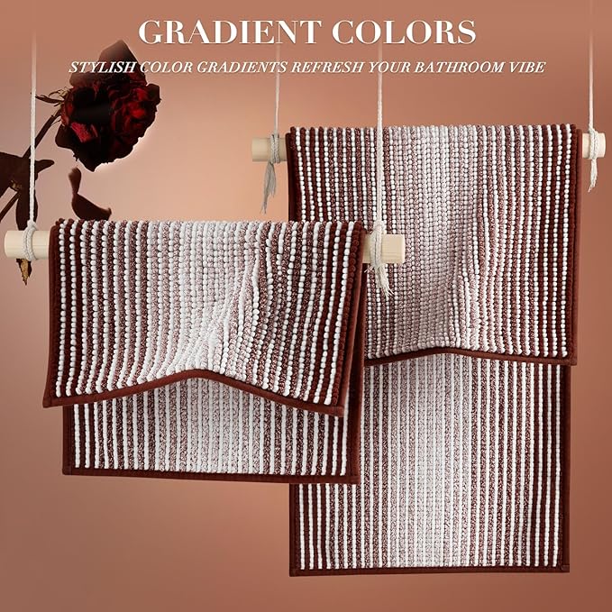 - 【EXTRA ABSORBENT BATHROOM RUG】: The luxury performance chenille microfibers can quickly absorb moisture from your feet when you step out of the bath or shower, and save your floors from dripping water, and dries quickly, making your feet feel the ultimate luxury enjoyment.