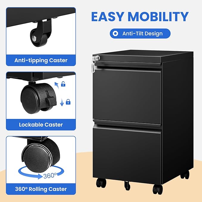 - 【Mobile File Cabinet 】: Equipped with 2 lockable casters + 2 x 360° swivel casters + 1x anti-tilt wheel, you can move this filing cabinet easily. 360° swivel casters go to any direction easily, while lockable casters offer braking and the center support wheel prevents tipping.