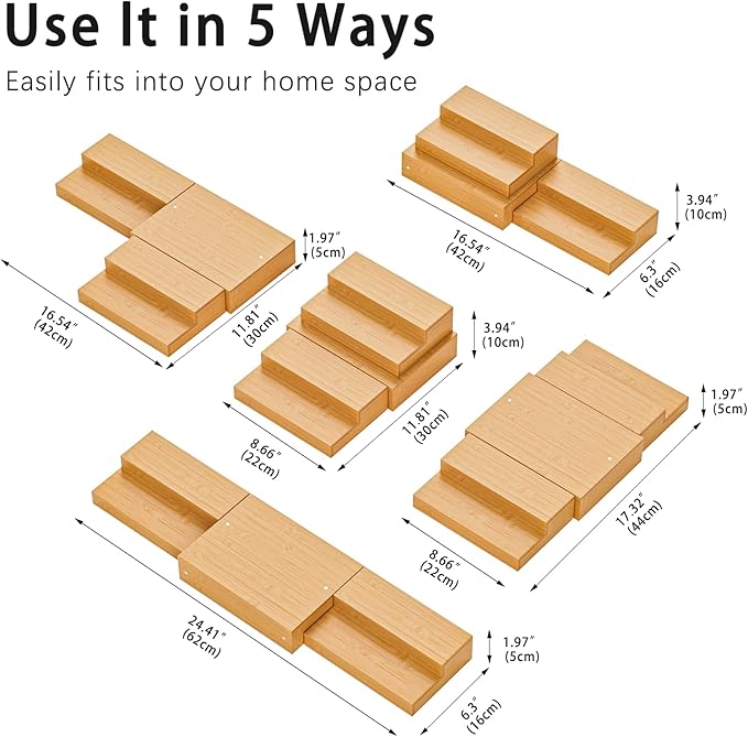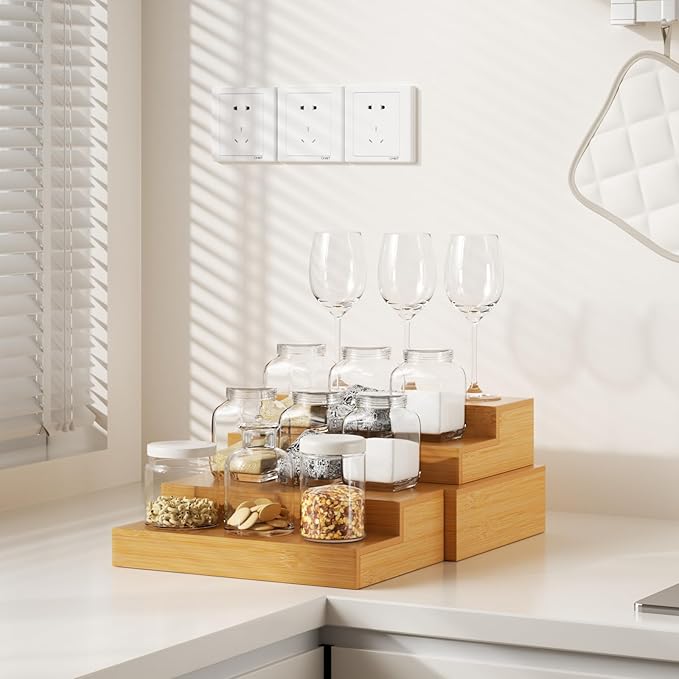 - ✅ Versatile 4 Tier Spice Rack: Bamboo Shelf Expandable Spice Rack, Organize not only spice bottles & jars, also vitamin bottles & essential oils and store cosmetics like lipstick and nail polish, stepped design make things visible and accessible, keep cabinet pantry or cupboard tidy