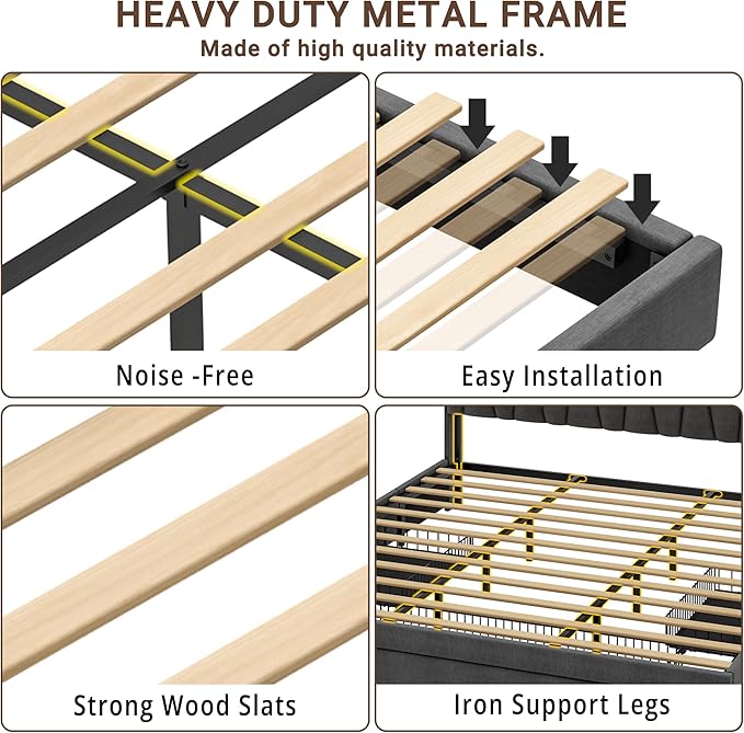 - Sturdy Construction & Strong Support: In addition to the solid metal frame and central cross design of twelve thickened wooden slats, we have added a heavy duty steel support bar under the headboard to give the bed frame a weight capacity of 700 lbs