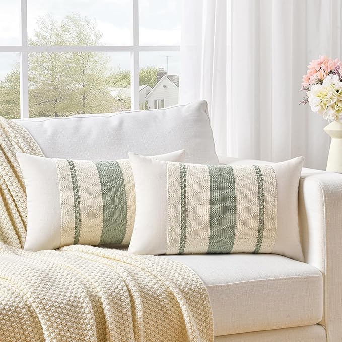 Fancy Homi Set of 2 Sage Green Boho Lumbar Decorative Throw Pillow Covers 12x20 Inch for Living Room Bedroom Couch Bed Chair, Rustic Retro Cushion Case, Bohemian Room Home Decor