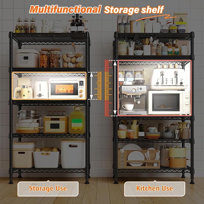 - 【Height adjustable Wire Shelf】Our heavy-duty storage rack is height-adjustable,witch means the height of each tier on this storage racks can be individually adjusted according to the actual demands of storing large or small items, thereby optimally accommodating a range of varying storage requirements such as Laundry,Pantry,Kitchen,Living Room,Closet.
