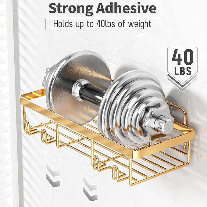 - 5 PCs Large Storage Shower Caddy: The bathroom shower organizer set comes with 3 Gold wall shower caddies, 1 soap holders, 1 toothbrush holder and 5 adhesives. The shower storage shelves can store all of your bath supplies