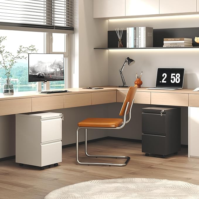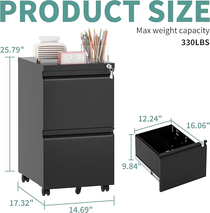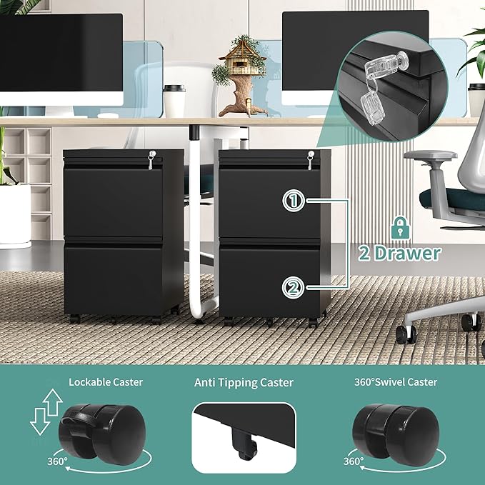 - ◉【Lockable & Secure】All the drawers of b;ack metal file cabinet can be locked by one lock, when one drawer of the metal file cabinet is opened, the anti-tilt and interlocking system prevents the other drawer from opening, ensuring your safety.
