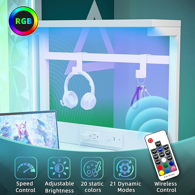 - LED Light Strip Included: Our desk comes with an integrated LED light strip, offering remote and app control for brightness, speed, and color adjustments. This feature enhances your workspace ambiance, providing dynamic lighting to match your mood and activities, perfect for gaming or working.
