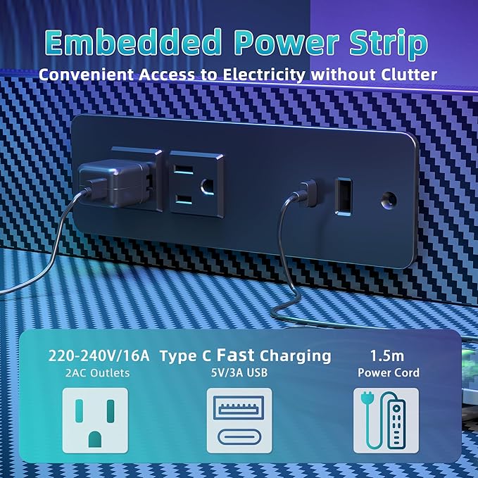 - LED Light Strip Included: Our desk comes with an integrated LED light strip, offering remote and app control for brightness, speed, and color adjustments. This feature enhances your workspace ambiance, providing dynamic lighting to match your mood and activities, perfect for gaming or working.