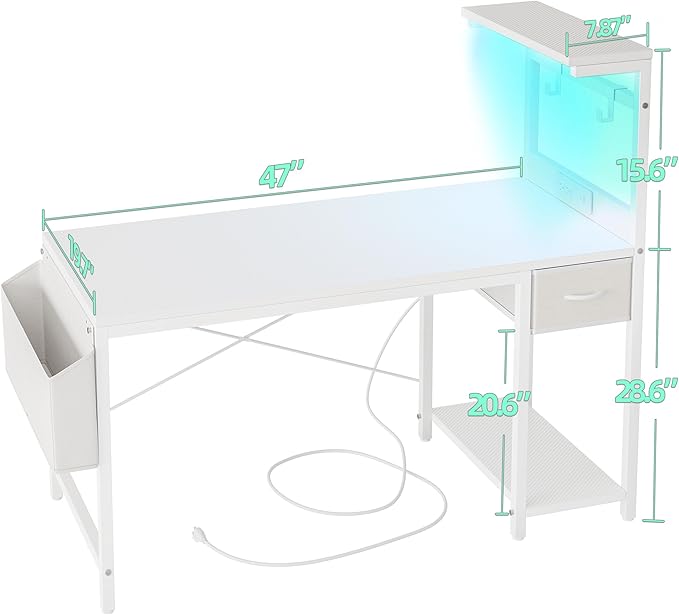 TIQLAB Gaming Desk 47 inch with Power Outlet and LED Light, Computer Desk with Reversible Shelves and Storage Drawer, Small PC Desk for Home Office Table with Bag, Carbon Fiber White