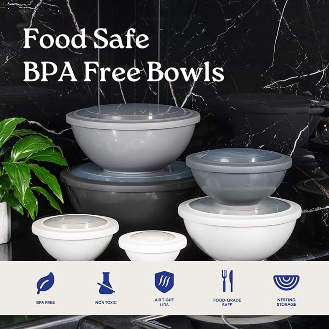 - 12 PIECE PLASTIC MIXING BOWL SET includes six bowl sizes, with matching lids, to meet all of food prep, storage, cooking, baking and serving needs. Bowl sizes include 0.32 Quart, 0.74 Quart, 1.37 Quart, 2.22 Quart, 3.69 Quart, 5.8 Quart.