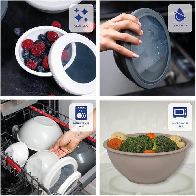 - EARTH TONE COLORS: Not only are these bowls great for mixing, cooking and storage, they are also great for serving. The beautiful earth tone colors make these bowls a stylish way to serve salads, pasta, fruit, vegetables, popcorn, chips or anything else on the menu. They also complement kitchen dΓ©cor when storing cereal or dry goods on your counters