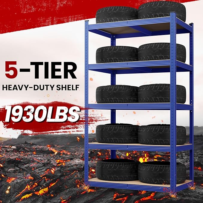 - Solid Storage Rack: This 5-tier storage rack is constructed of heavy-duty steel and durable CARB P2-compliant MDF boards. Each tier is capable of bearing 386 lb, a total of 1925 lb. Please note, for your safety, do not overload this shelf