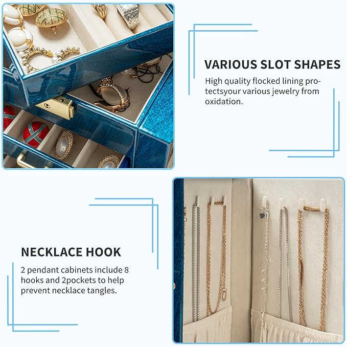 - 【PERFECT CAPACITY,JUST TOP LAYER CAN BE LOCKABLE】With 6 versatile pull out drawers, this jewelry box can store jewelry accessories, such as rings, earrings, necklaces, chains, bracelets, and so on. One deeper drawer is designed for large jewelries. For privacy,there have a key to lock the top layer