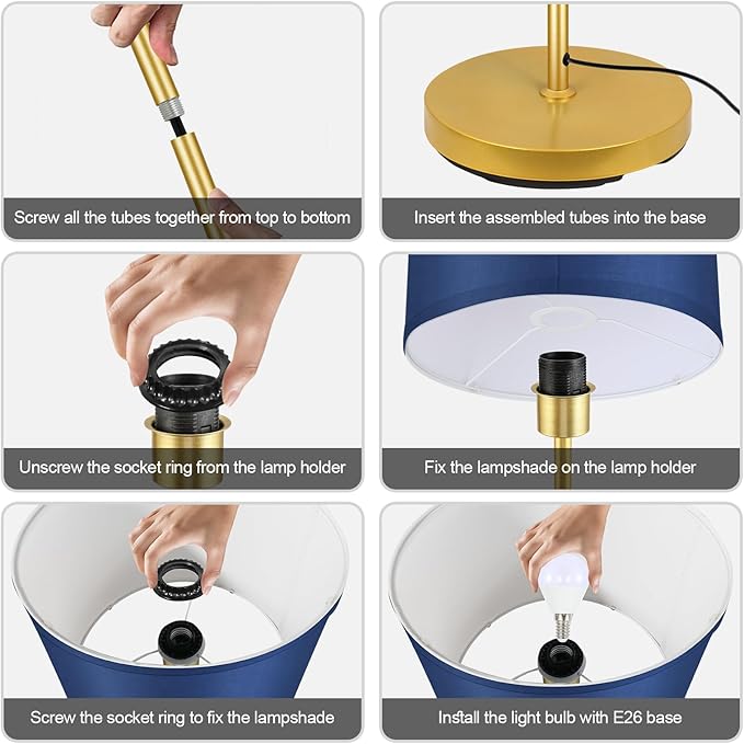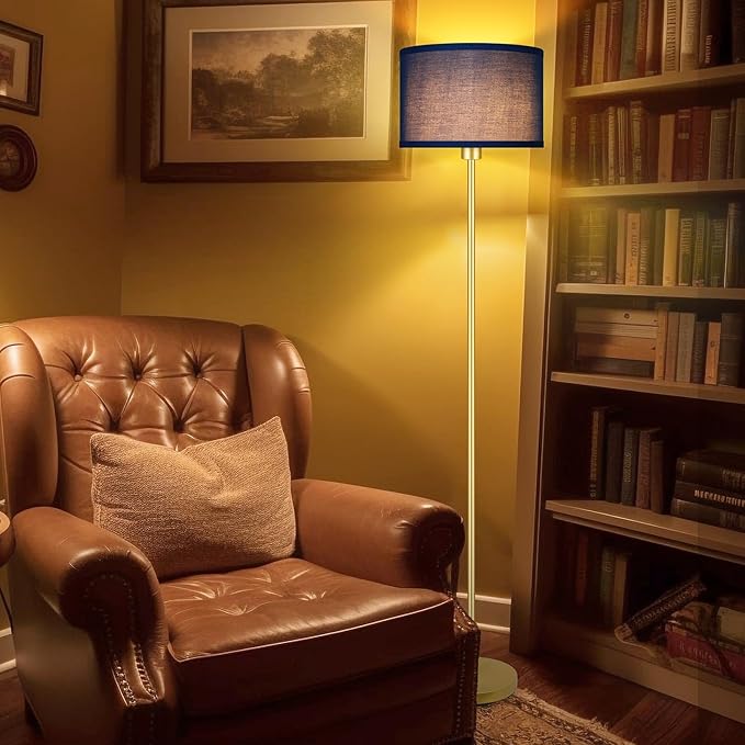 - 【Easy Assembly & Premium Quality】Made with gold metal body and blue linen lampshade, the led floor lamp is simply designed and look good in any surroundings; With the 6lb sturdy base, this 58-inch (5ft) tall lamp stands steadily and won't tip over easily, which is safe for kids; Without tools required, you just need to screw all the parts together to finish the assembly of this standing lamp; PS. The assembly video is attached to the product page