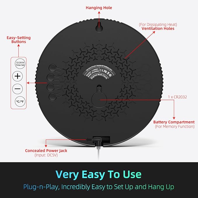 - [EXTREMELY USER-FRIENDLY] -- This plug-in wall clock is incredibly easy to set up, and the 10Ft long USB Cable allows you to hang it wherever you desire.