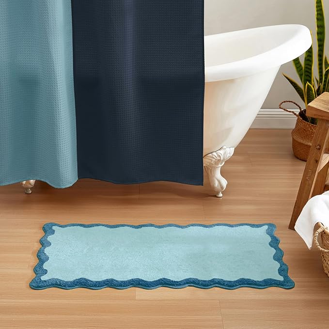 MONDAY MOOSE Bath Mat with Scalloped Wavy Ripple Design, Microfiber Absorbent Non Slip Tufted Rug for Floor, Shower or Kitchen (24x47 inch, Blue)