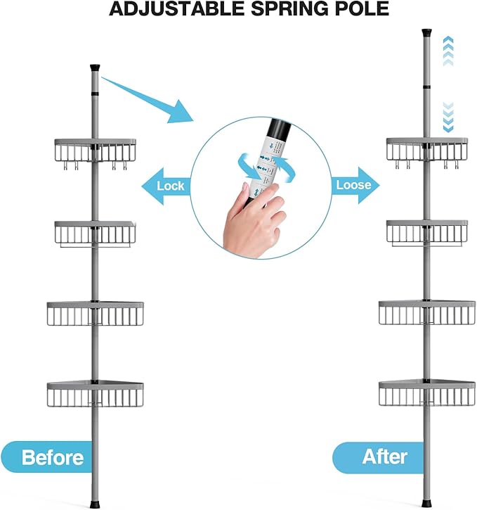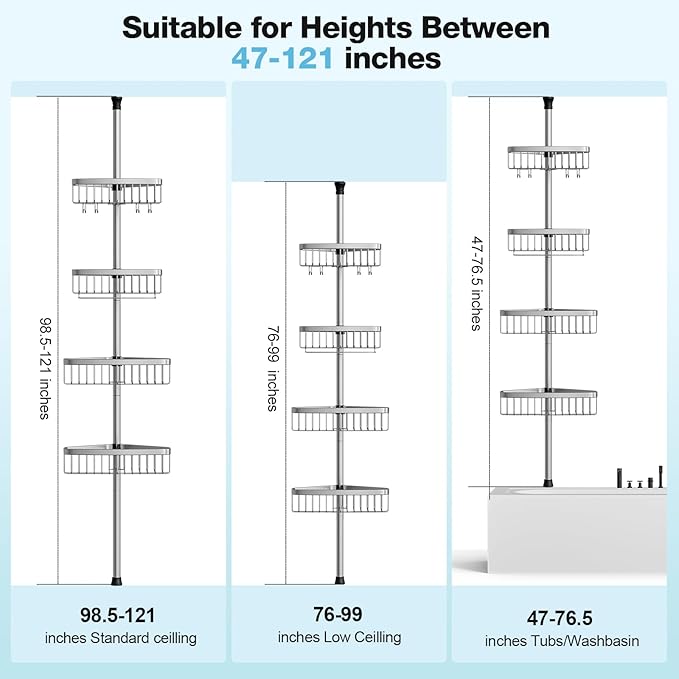 - Adjustable Height (47-121 Inches): This shower rack is designed to fit heights between 47 and 121 inches, eliminating the need for cutting the rod. Make your bathroom or shower room look beautiful and organized