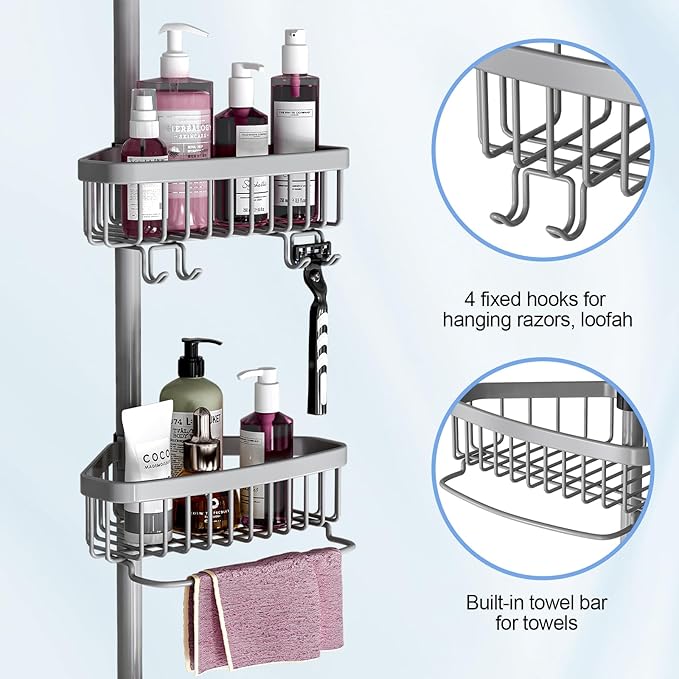 - 4 Adjustable Large Capacity Baskets: Our shower caddy tension pole features four baskets of varying sizes, along with four fixed hooks for hanging razors or shower balls and a built-in towel bar. Each shelf can hold two large 32-ounce pump bottles alongside several smaller 16-ounce bottles, maximizing your shower storage space