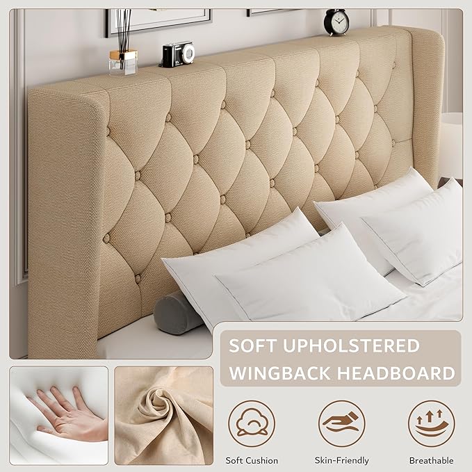 - Upholstered Bed Frame: This wingback bed frame features a soft and comfortable button tufted headboard that you can easily lean against. The winged sides not only secure your pillows but also provide a convenient shelf on top, perfect for placing glasses and phones, making it both practical and functional