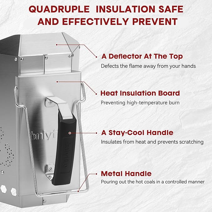 - 【Multiple Protection】A stay cool handle is big and spaced far enough away from the body of chimney that you can easily grip it with a heat resistant glove, which stay protected from the quick-lighting heat of this barbecue fast-starter. Heat Insulation Board is made of heavy materials, effectively prevents your hands from getting burnt. In addition, a deflector at the top above the handle will save you some heat after you've started the charcoal as it deflects the flame away from your hand.