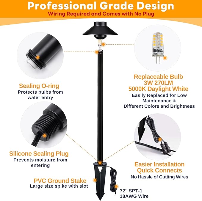 - 𝐈𝐏𝟔𝟓 𝐖𝐚𝐭𝐞𝐫𝐩𝐫𝐨𝐨𝐟 Rain or Shine: Constructed with waterproof heavy-duty brass, feature sealed silicone rings to prevent water entry. These wired low voltage path lights ensure stable and consistent lighting, perfect for year-round outdoor use – no more worrying about storm damage or moisture corrosion