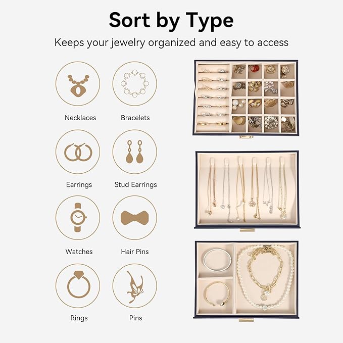 - DIY Considerate Details: This sleek jewelry box comes with stackable layer and removable compartments create large capacity and different layout. With removal baffles can meet different needs and keep all types of jewelry organized, neatly, beautifully displayed. You can visually see all of your precious belongs, makes selection easier,while being space savvy!