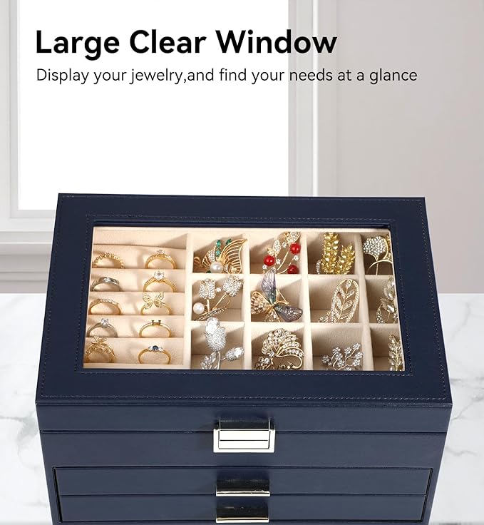 Voova Jewelry Box Organizer for Women Girls, 3 Layer PU Leather Jewelry Storage Case with Glass Lid & 2 Drawers, Large Jewellery Display Holder for Necklaces Rings Earrings Bracelets, Navy Blue