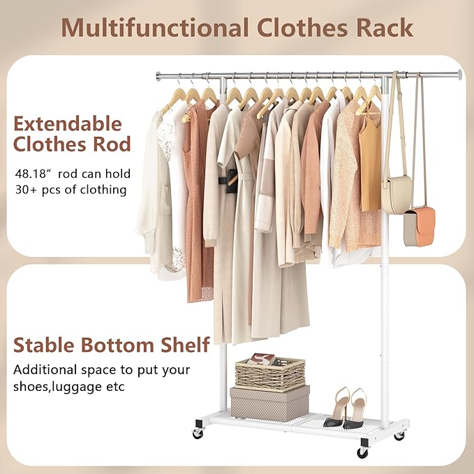 - 【Practical Product Design】The top horizontal rod of the garment rack can be extended from 31.1 inches to 48.19 inches. The garment rack is small but still has enough storage space. The top of the garment rack has stoppers on both sides, not only prevents clothes from falling off, but also provides a perfect place for hats. The small shoe rack at the bottom of the garment rack can store shoes or storage boxes, it not only gives you more storage space but also makes the garment rack more stable.