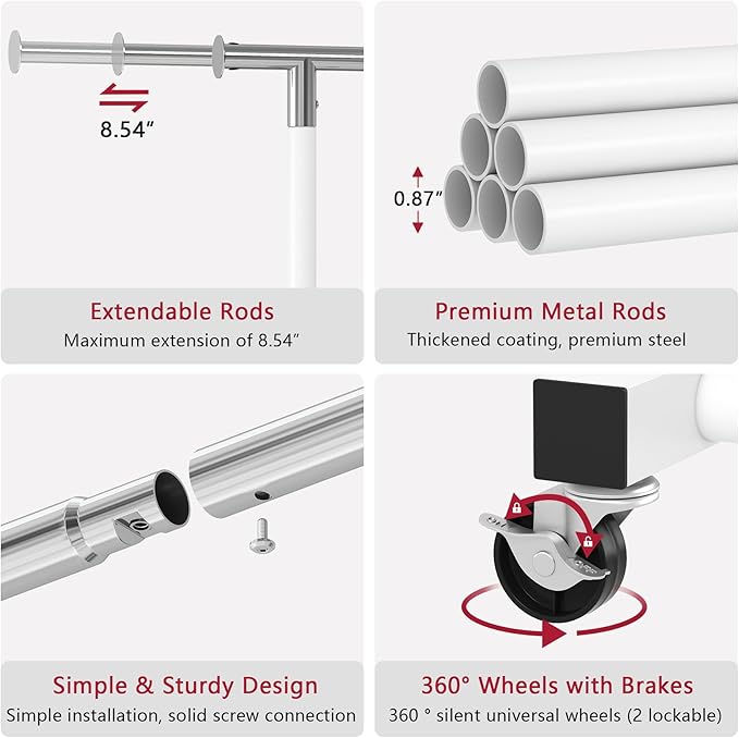 - 【Movable & Stable Stopping】The bottom of the garment rack has four wheels that can rotate 360°, which makes the rack flexible and easy to transport. Two of the wheels can be locked so that the garment rack can be stopped stably. Meanwhile, the wheels will not make noise or scratch the floor when rolling.