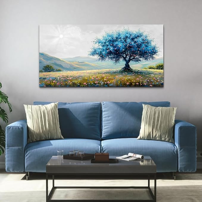 FUHAIHUA Large Wall Decor For Living Room Canvas Wall Art For Office Modern Wall Decorations For Bedroom Pastoral Landscape Painting Blue Tree Pictures Artwork Room Aesthetic Home Decor 24x48 In