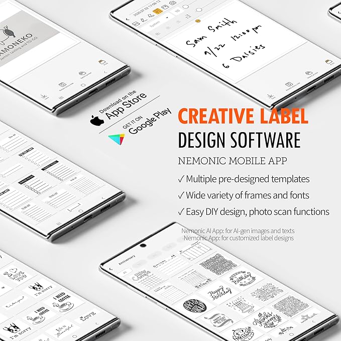- USER-FRIENDLY MOBILE APP. The Nemonic app offers diverse templates and fonts, integrating smoothly with MS Office files. Its scan-and-print function eliminates handwritten memos to enhance efficiency in various settings. This label sticker printer simplifies your label creation process effortlessly.
