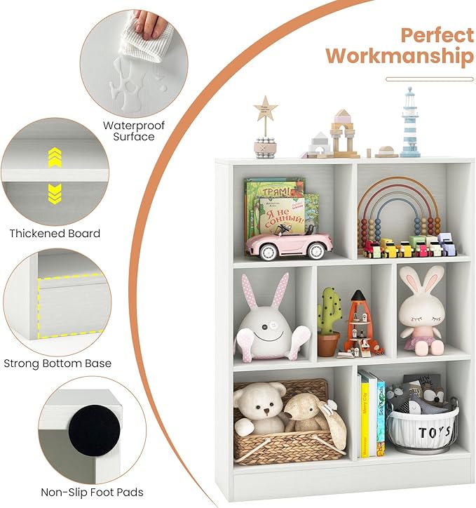 Costzon Wooden Toy Storage Organizer, 7-Cube Kids Bookshelf w/ 2 Anti-Toppling Kits, 3 Tier Open Shelves & Non-Slip Foot Pads, Book Shelf for Kids Rooms, Playroom, Classroom, Nursery (White)