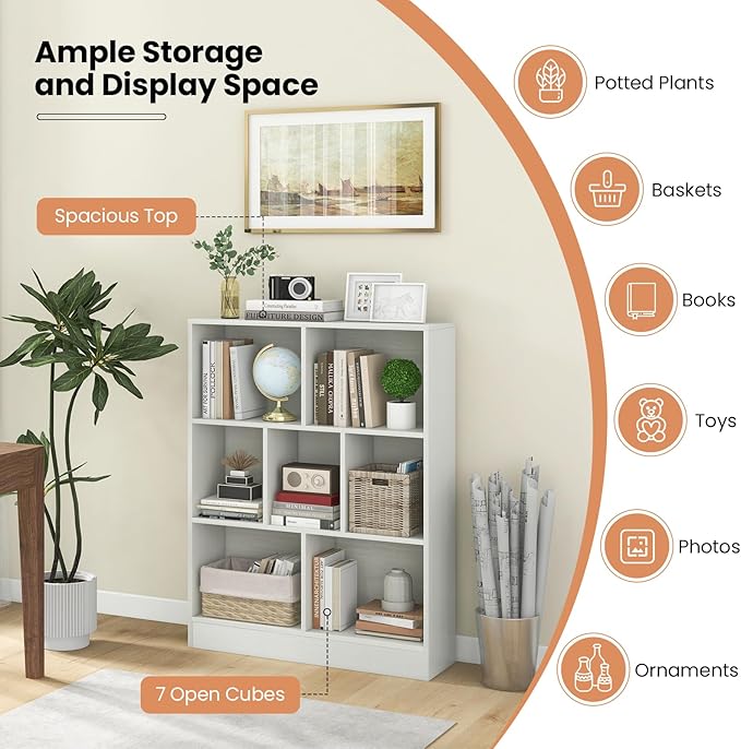 - Ample Storage Space: Transform your child's room into an organized room with our 7-cube kids bookshelf. The kids cube storage cabinet offers plenty of space for toys, books, art supplies, and more. Each cube of this 3-tier kids bookcase provides dedicated space for sorting items. Also, the wide top of the cubbies bookshelf adds extra display space for child's favorite treasures.