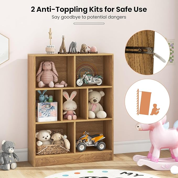 Costzon Wooden Toy Storage Organizer, 7-Cube Kids Bookshelf w/ 2 Anti-Toppling Kits, 3 Tier Open Shelves & Non-Slip Foot Pads, Book Shelf for Kids Rooms, Playroom, Classroom, Nursery (Natural)