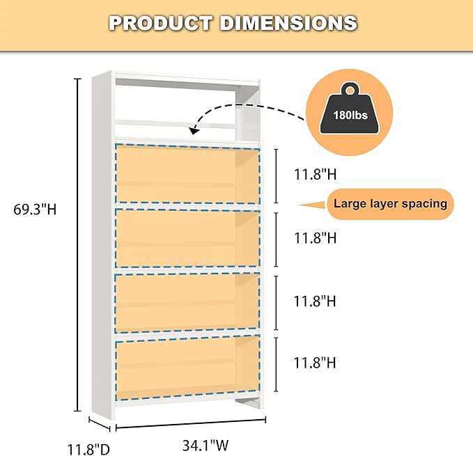 - 【Size】69"H*34"W*11.8"D.Taller and Wider bookshelves.Easy assembly | Extra-tall 11.8" shelf spacing | Heavy-duty construction holds more books | Long-lasting durability |No odor, no pollution.Professional service team for you to solve any problems