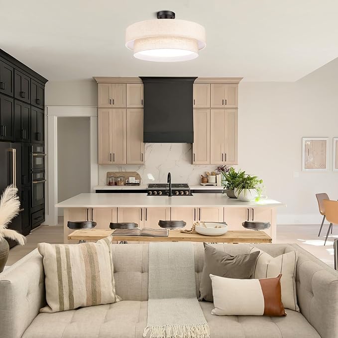 - π¦ Large 2 Layer Ceiling Light Fixture Semi Flush Mount with Fabric Shade, This 20 inch drum ceiling light fixture overhead provides superior lighting within the beige fabric shade. 5 Color Temperature 3000K 3500K 4000K 5000K 6000K are convenient to meet your preference. Add lighting anywhere in your sweet home with this modern yet industrial dimmable ceiling lamp. This LED flush mount ceiling light 20 inch is not only functional but also a modern dΓ©cor in the kitchen, dining room over table, entryway, hallway, bedroom, basement etc.