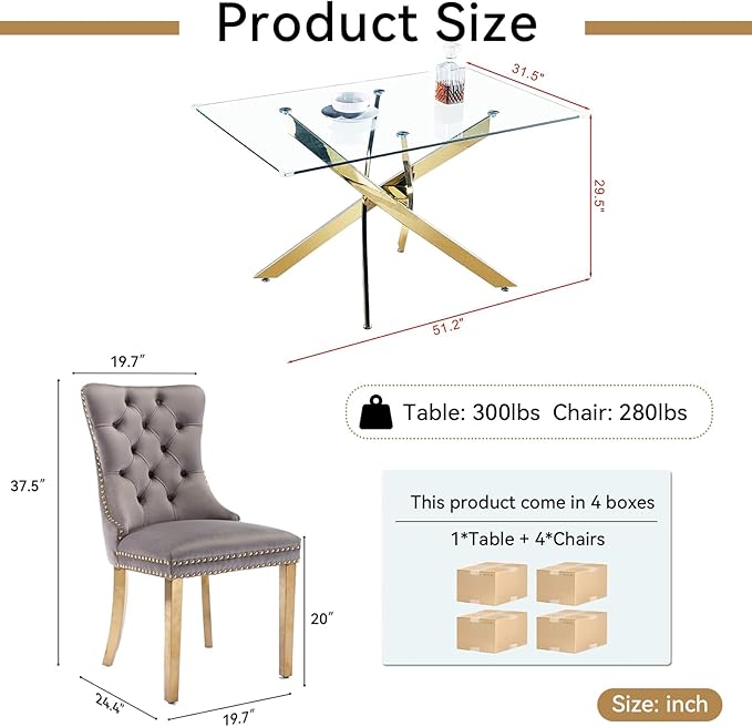Goujxcy 51" Glass Dining Table Set for 4, Modern Kitchen Table and Chairs Set w/Steel Legs, 5-Piece Dining Table Set w/Glass Gold Dining Table and 4 Grey Velvet Chairs for Kitchen Dining Room