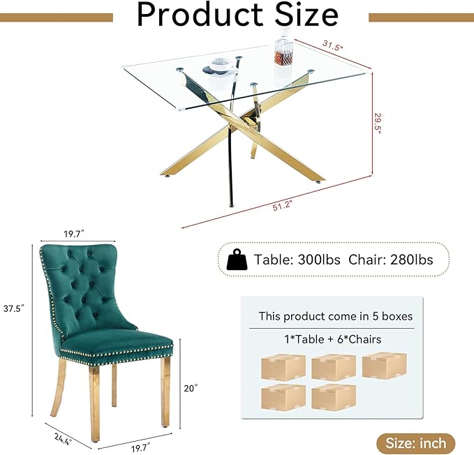 Goujxcy 51" Glass Dining Table Set for 6, Modern Kitchen Table and Chairs Set w/Steel Legs, 7-Piece Dining Table Set w/Glass Gold Dining Table and 6 Green Velvet Chairs for Kitchen Dining Room