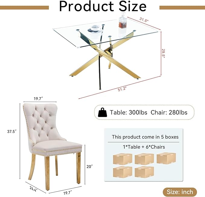 Goujxcy 51" Glass Dining Table Set for 6, Modern Kitchen Table and Chairs Set w/Steel Legs, 7-Piece Dining Table Set w/Glass Gold Dining Table and 6 Beige Velvet Chairs for Kitchen Dining Room